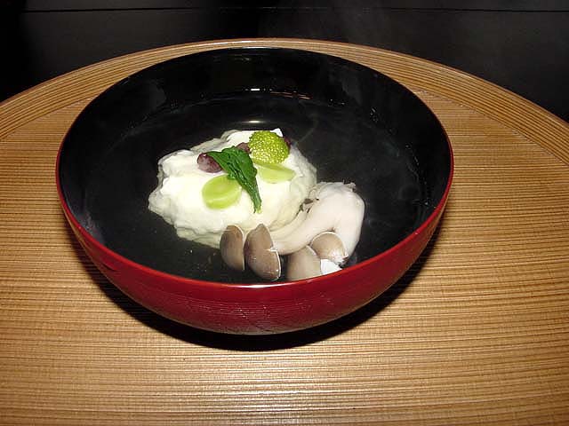 椀 2品目の椀がいつも楽しみ 萩真蒸 柚子・銀杏・小豆・海老 |
