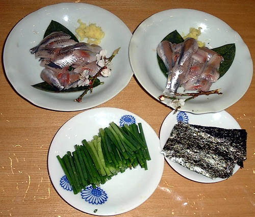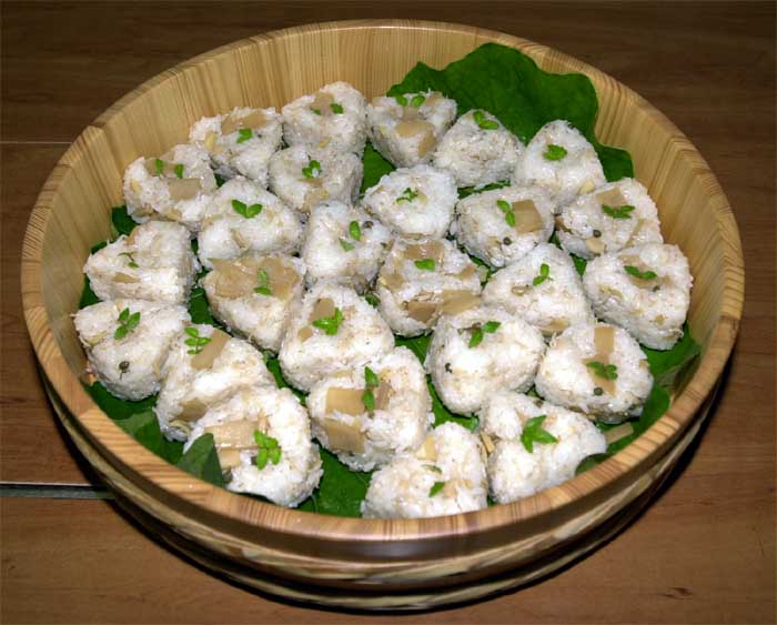 濡らした包丁で切り分けて皿にとり、山葵か生姜を溶いた醤油で食しますと、