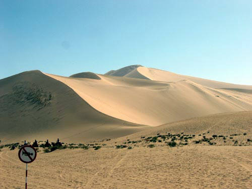 敦煌の空港に着いて今回の旅行で一番ヤバイ目に会いました。ガイドブックでは街までのリムジンは無いと書いてあったのですが、タクシー乗り場に行くとハイエースにリムジン6元と紙に書いて張ってあるのです、聞くと市内まで行くが他のお客が来るまで待てと言う事でした。飛行機から降りた客は全部散ってしまい、結局私一人になるとリムジンと書いて貼ってあった紙をはがして車になおし、近くに止めてあった車に乗れと言います。荷物を持っていかれるし言葉はまるっきり通じないし、仕方無しに車に乗りましたが、フリーの旅行者を釣るもぐりのブローカーだったのです。筆談でやり取りをしながらホテルに連れて行ってはくれましたが、ホテルに着くまでは、一体何処に向かっているのかも判らず、背筋は寒く、緊張の連続でした。ホテルに着けばフロントにいるスタッフを介して話が出来るだろうと思っていましたが、これが言葉がまるっきりダメ、しかし相手も何とか仕事にしたいのか、携帯をかけまくって日本語の話せるガイドをホテルに連れてきました。結局3日間、車をチャーターして600元と言う事で頼む事にしました。北京のようにホテルで情報を仕入れて動くと言う事がここでは出来なかったので結果オーライだったかもしれません。荷物を置いて一休みし、鳴沙山という砂丘に行きました。敦煌の南側に広がる20キロメートル四方の砂丘で映画や写真で見るあの砂漠そのものでした。砂丘の上に登り近くの稜線を3時間かかってひと回りしましたが、服から靴まで砂だらけになり面白い経験になりました。