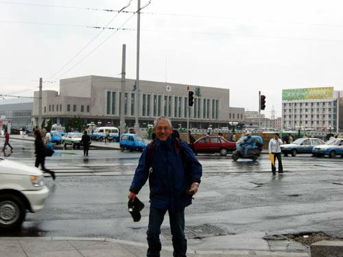 <大連駅前にて、風が強くて帽子が飛ばされた>