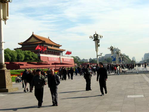 中国漢字で書かれているためさっぱり判りません、あきらめてタクシーに乗りましたが全く言葉も通じず、見せる住所は日本語漢字で運転手には理解できないらしく、結局書いてある電話番号に運転手が携帯TELをしてくれて、ホテルに着く事が出来ました。前門と言う繁華街の近くで、結構便利なロケーションでした。フロントに一人英語が判る娘がいて彼女から情報を仕入れ観光に出かけました。まず15日の早朝の北京空港へのリムジンバスの時間とバス停の確認に地図を片手に西単と言う所へ行きました。宿からは徒歩で15分ぐらい、始発は6:00と言う事で一安心。そのまま歩いて天安門へ、TVなどでおなじみのあの門が有りました。