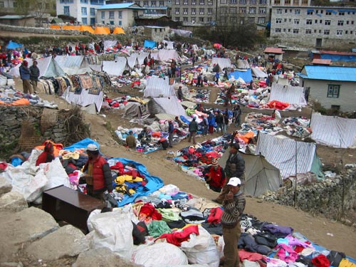 バザールを見に行きました。商売をしている人たちはチベットから荷物を担いで来て、広場に簡易テントを