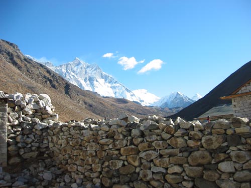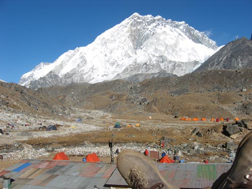 (今日の宿からの風景、テントはカラパタールへのキャラバン隊のもの、山はヌプツェ)