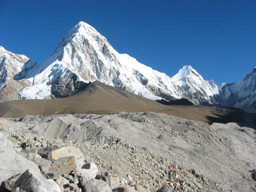 (今回の最終目的地カラパタール、茶色の部分のとんがった所、後ろの山はプモリ7165m)