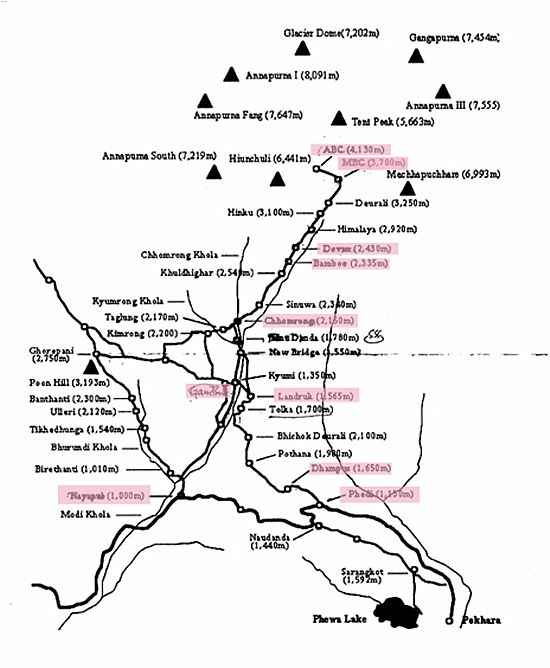 左の谷筋の先には、アンナプルナサウスが、右のそれには、マチャプチャレガそびえたっている。又右の谷筋のかなり先に明日の