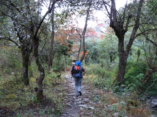 て、快晴の天気です。今日はランタン村3330mまでの行程です。林間の急登を登りきると