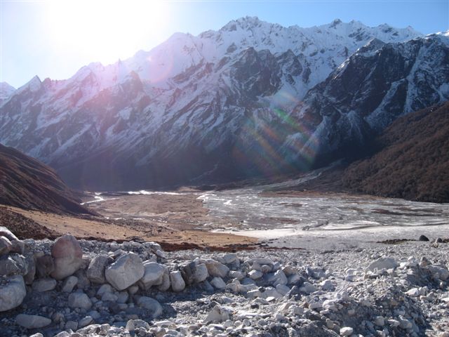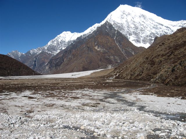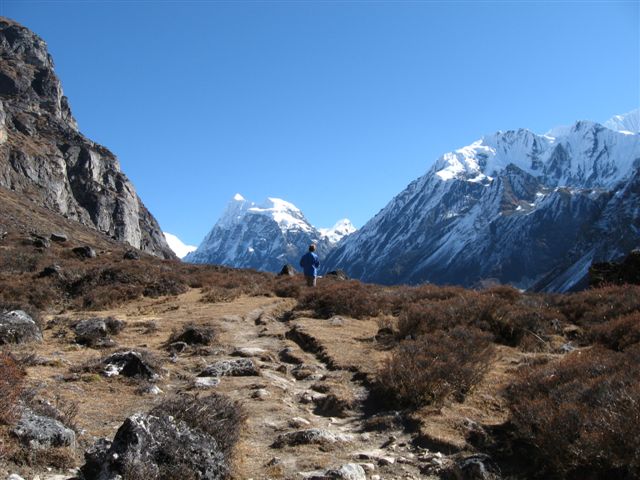 谷の両側は切り立った岩山、正面には真っ青な空をバックに真っ白な雪をかぶ