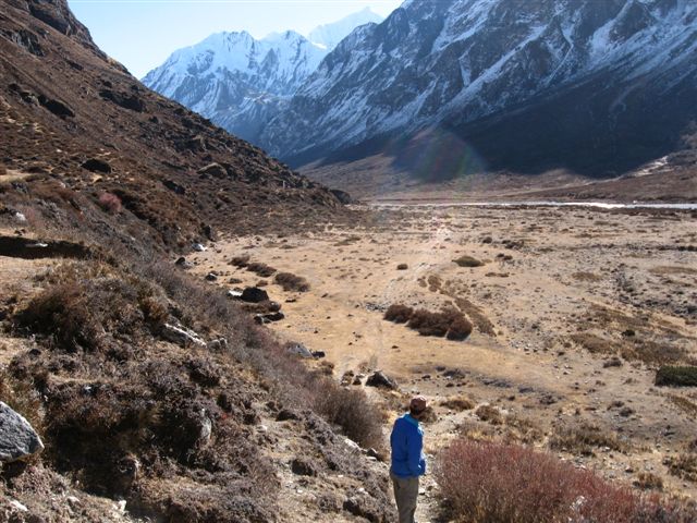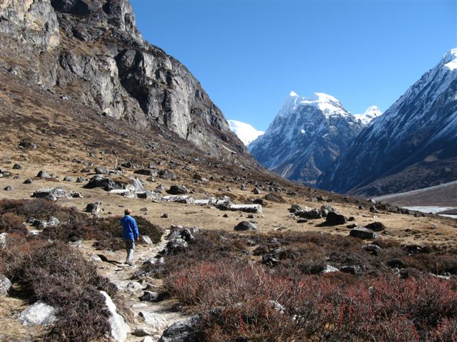 今日も快晴、谷はどんどん広がっていき枯れた草地に紅葉した背の低い潅木