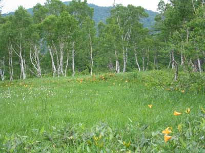 手前にニッコウキスゲ、白い点のようなものはワタスゲで