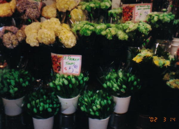 お花やさんにはこの時期、緑色に染められたチューリップやカーネーションがありました。