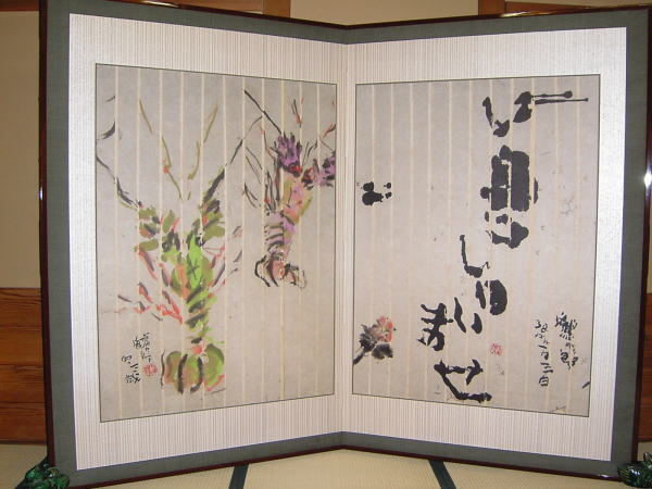 鶴太郎描くところのこの屏風がお出迎えです。