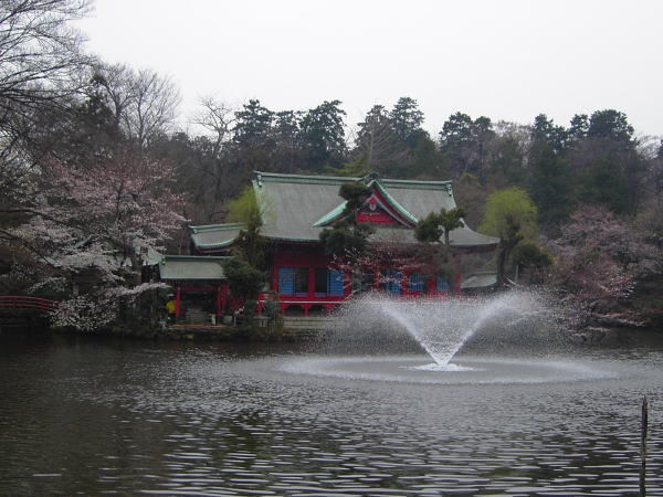 噴水の向こうに見えるは弁財天堂。艶やか。