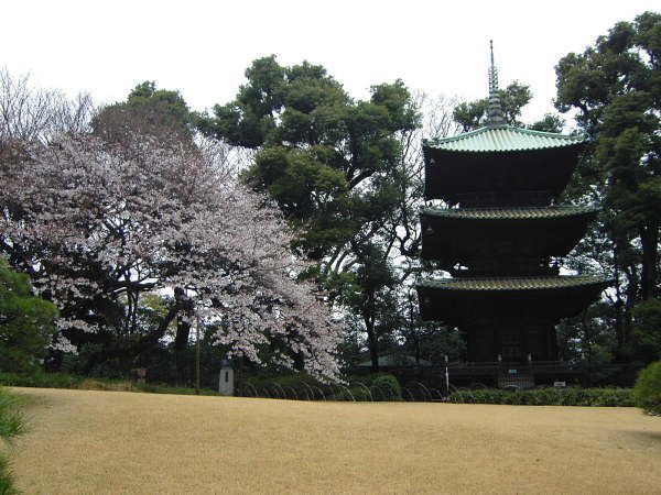 庭園内、三重の塔横の桜は日当たりのよいお蔭か咲いていました。