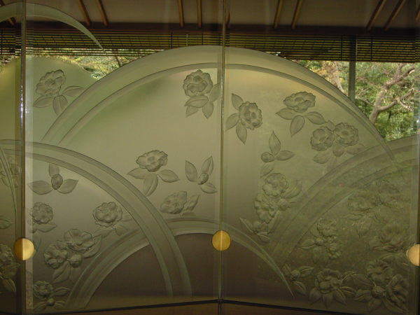ロビーと廊下を隔てるガラスの屏風も椿の柄で美しく・・・