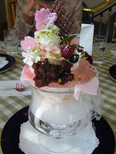 ぎゅうひ、桜色のアイスクリーム、桜色のゼリー、生クリーム、あんこ。