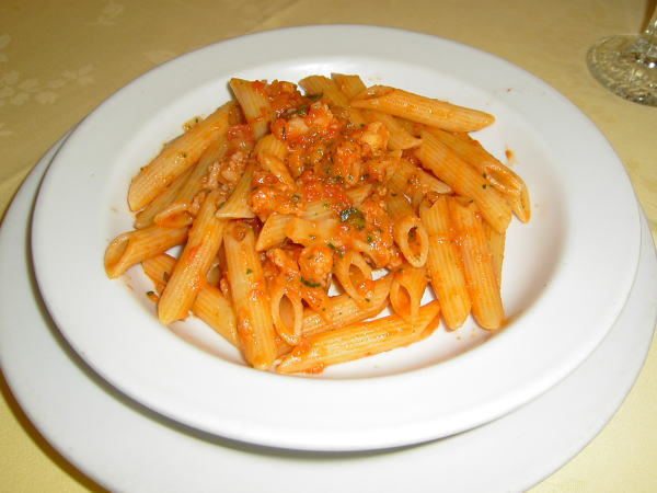 この日選んだパスタはペンネで、海老とカリフラワーのトマトソース。