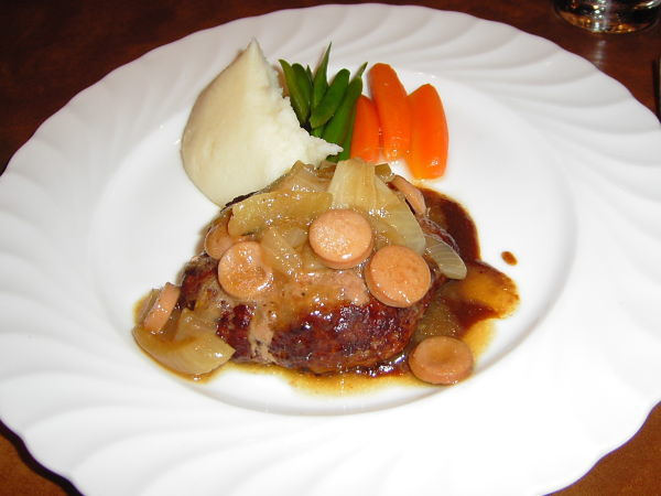 この日のメインはハンバーグ。ポタージュスープとサラダ、パンorご飯、