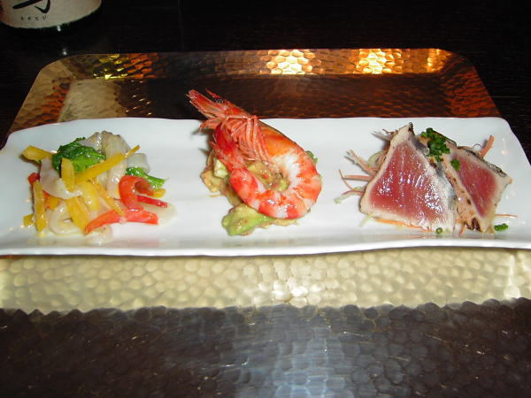 前菜3種 左からあおり烏賊と赤・黄ピーマンのマリネ。海老、鰹。