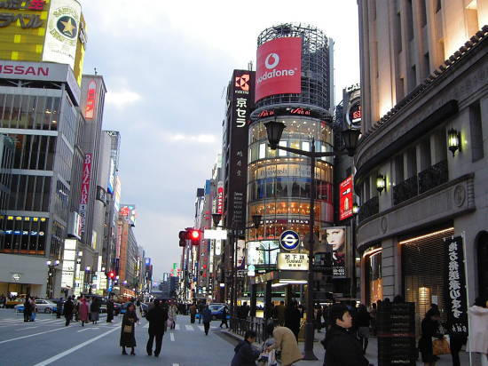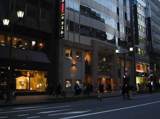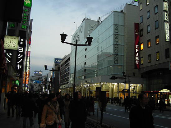 後ろには鳩居堂があります。 (4丁目から新橋方面を望む)