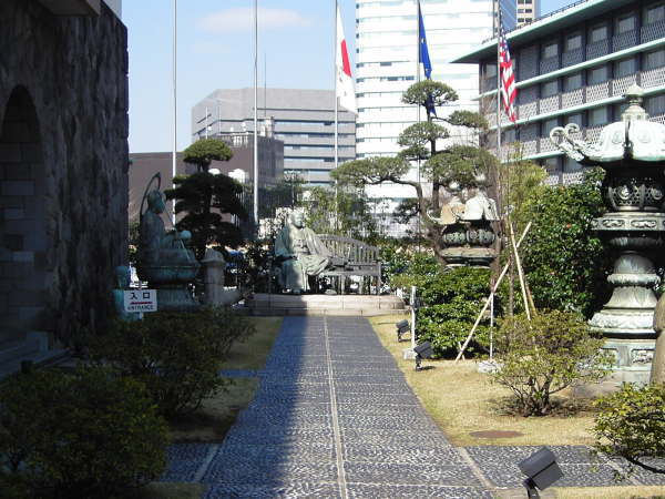 正面、大倉喜八郎の像。庭園には仏像、灯篭と日本的な空間です。