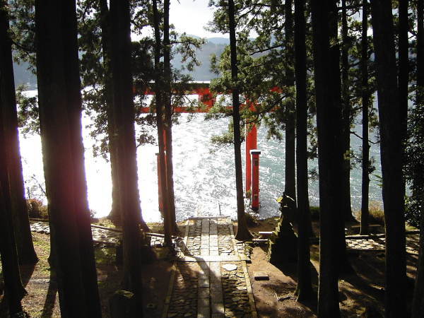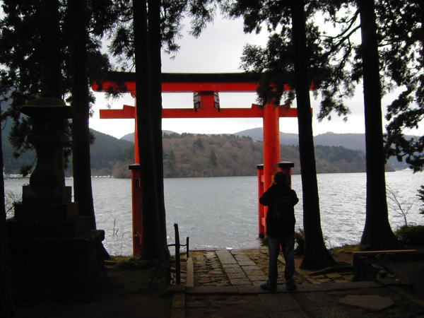 鳥居の向こうは芦ノ湖です。外国人が鳥居を撮影中。