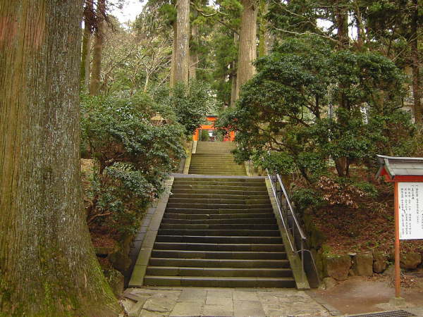本殿まで石段を登ります。高い杉木立が歴史を感じさせますね。