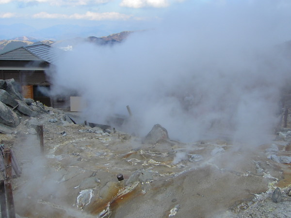 爆裂火口で、今もなお熱い水蒸気と硫気を噴出しています。