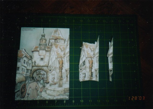 もちろんボタンも切り抜いて丸みをつけて貼り付けます。一番だいへんだったのは右の建物、店先に