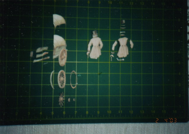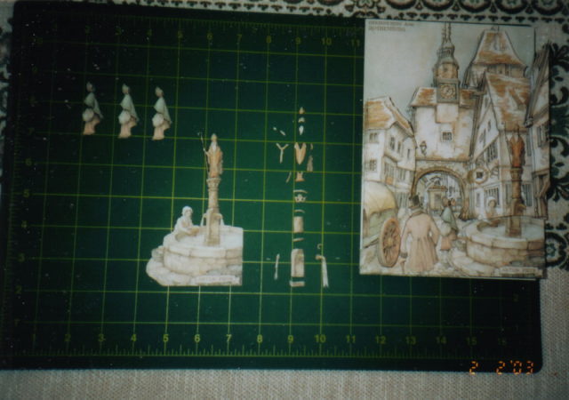 石畳の石もひとつずつ貼っています。紳士のコートも肩には丸みをつけたり裾に動きをだしたり。
