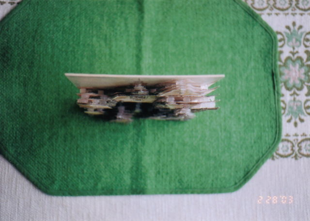 上から見たところ。 接着剤分の隙間が紙の間にできています。