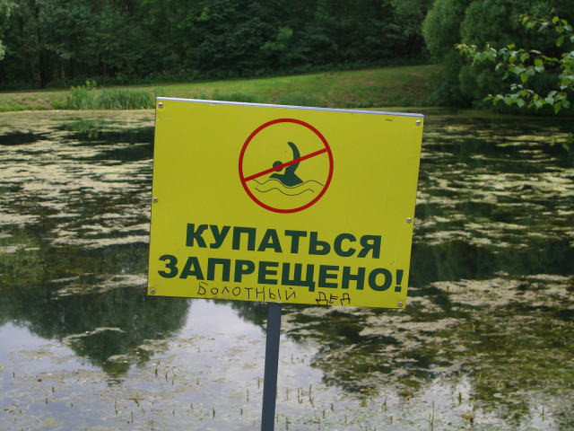日本庭園入り口前の池の看板。 「水浴禁止」と書いてある。