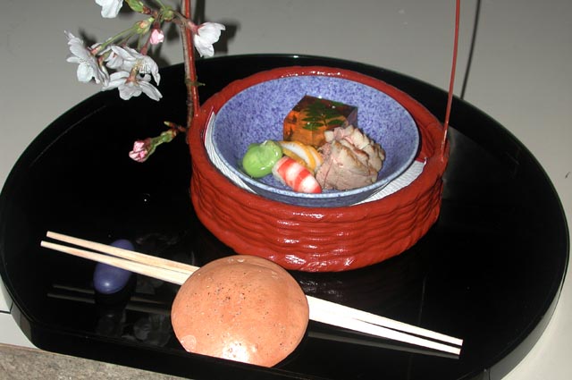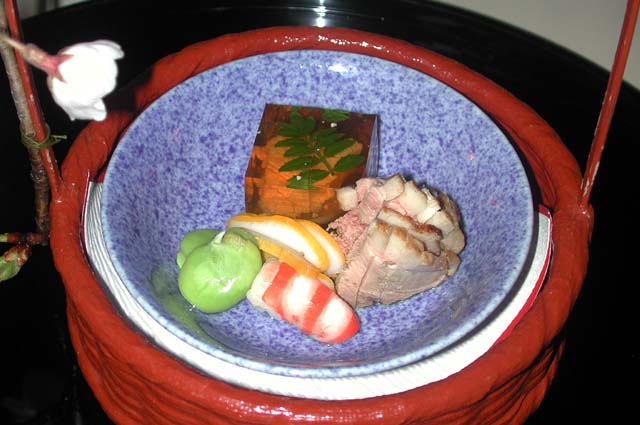 鯛肝煮凝り、烏賊黄身焼き、合鴨、車えび、空豆