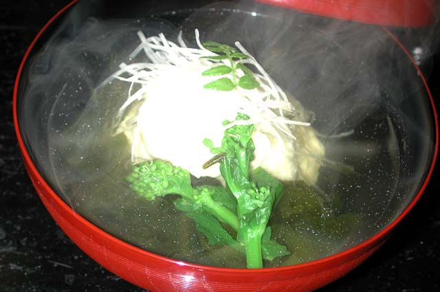 海老真蒸、若布、菜の花、針独活、木の芽