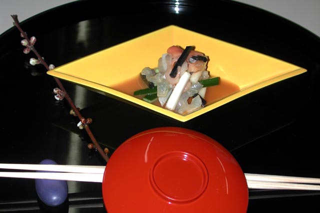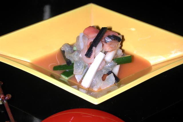 赤貝、サヨリ、胡瓜、独活、水前寺のり 生姜、加減酢 相混ぜ
