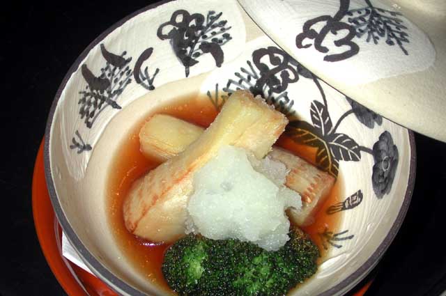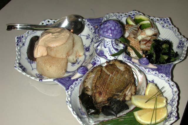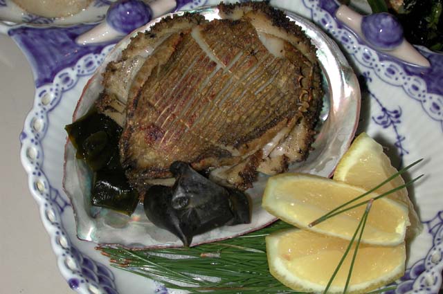 焼きアワビ/春若いも、春子椎茸 ゴマクリーム掛け