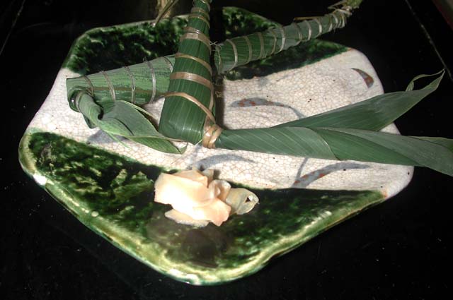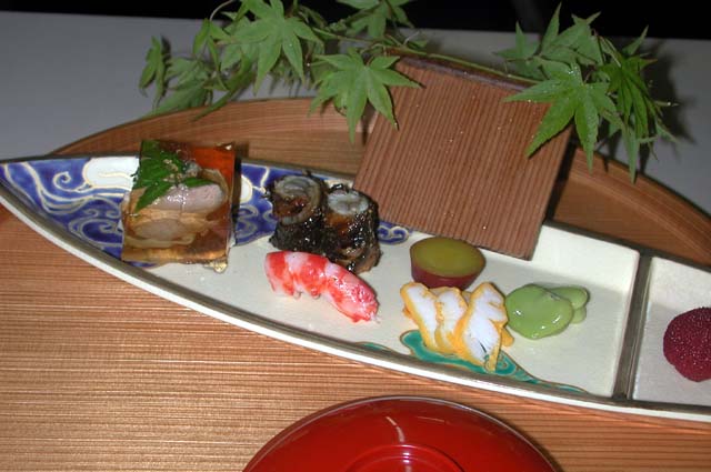 鯛肝煮凝り、鰻八幡巻き、車海老、烏賊黄味焼き、丸十、ソラマメ、山桃