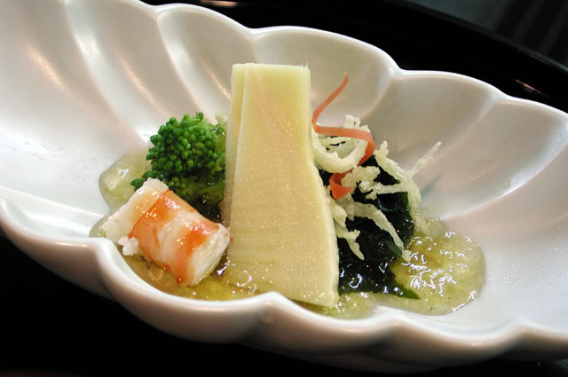 パール12曲向皿にて 菜の花、若芽、竹の子、白魚、車海老