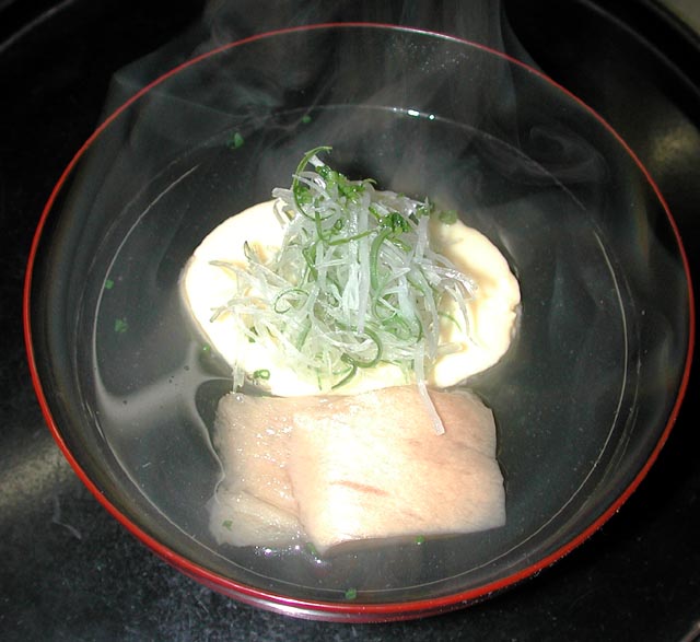 すっぽん豆腐、車麩、白髪葱、生姜汁