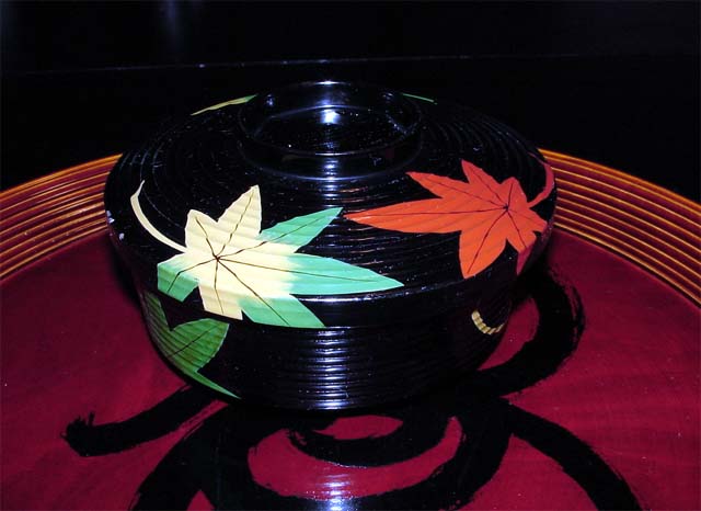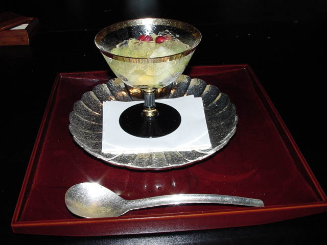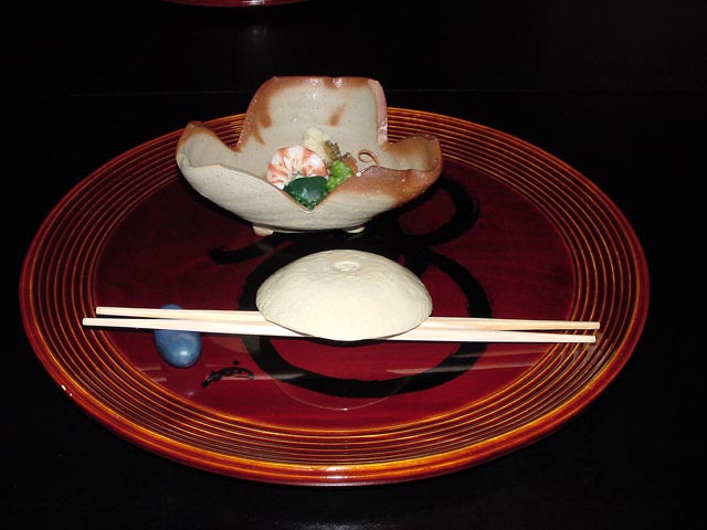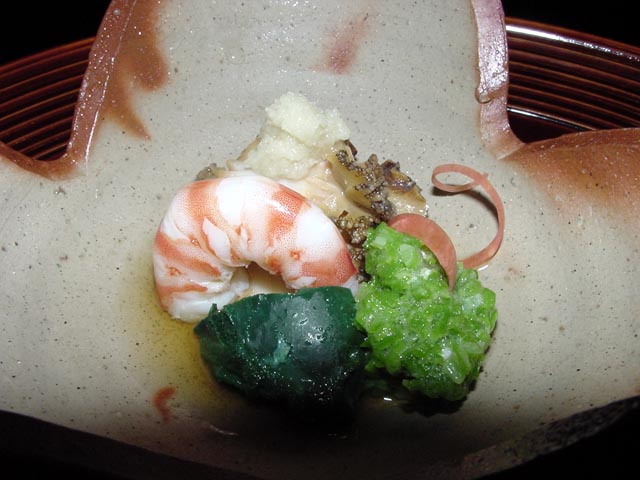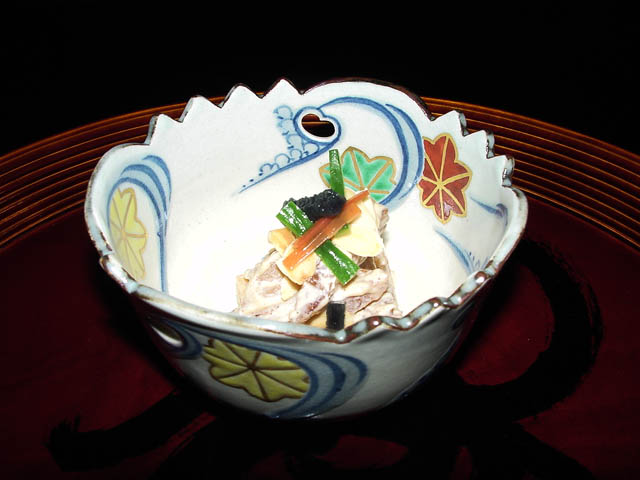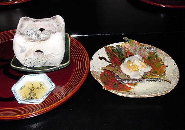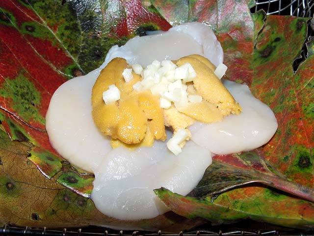 | 柿の葉焼き | 帆立、雲丹、霰生姜 煮きり酒を添えて |
