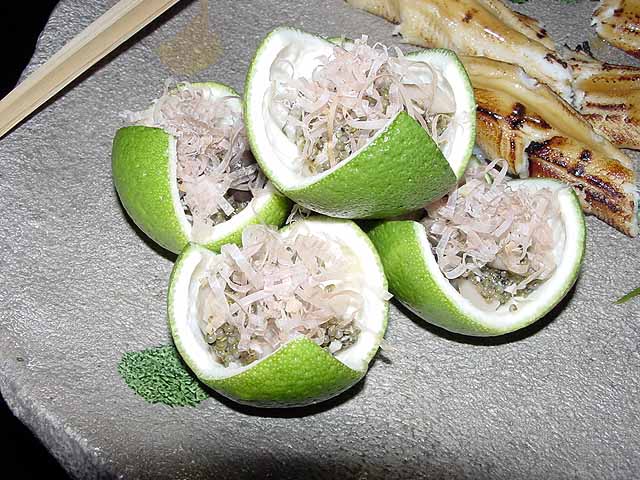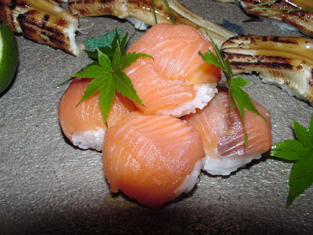 | カボス割山椒にトンプリ | サーモン手まり寿司 | 穴子にぎり |