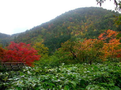 紅葉したもみじそして清々しい緑の木々の中に