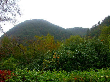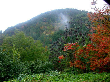 なだらかな山体に木々の紅葉が疎らに見えます。