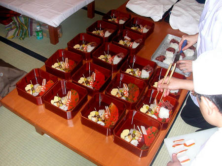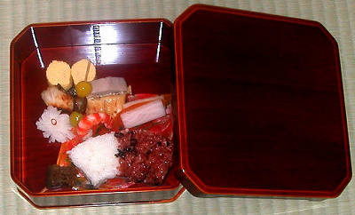 大徳寺縁高に口取りと扇面に作った紅白の御飯を盛り付けます。