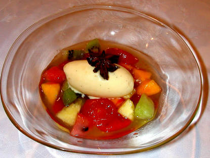 デザートはフルーツポンチにバニラアイス、 上の黒いのはハッカク。