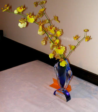 ほかのテーブルにあった巻貝の形をした花器、活けてある白い花
