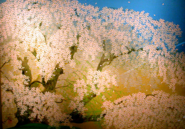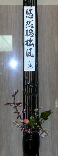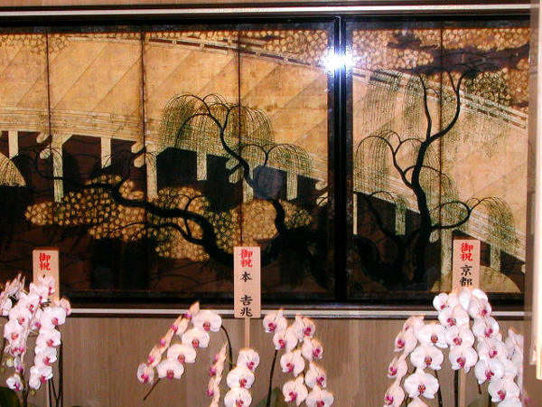 玄関正面には ”而妙斉”表千家家元の短冊が、その奥には柳橋図屏風。