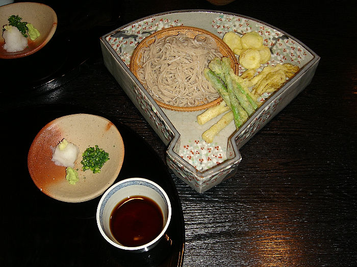 蕎麦 春野菜天麩羅添え(独活の芽、アスパラ、小玉葱)