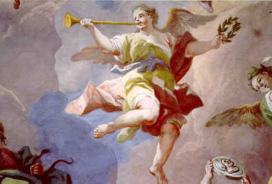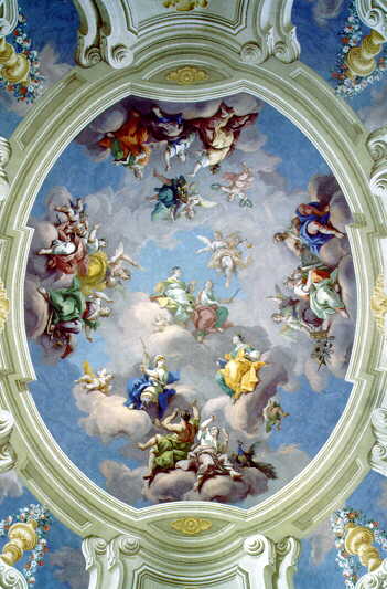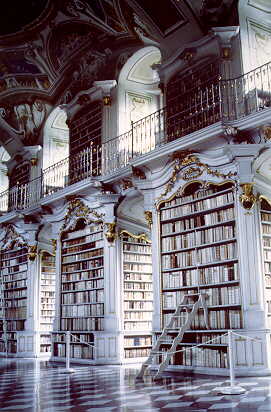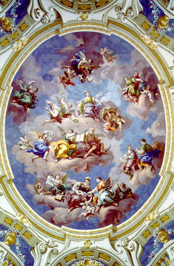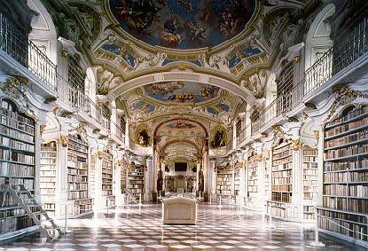 修道院図書室:絶頂期のバロック様式にて華麗に装飾されている.丸天井にはフ