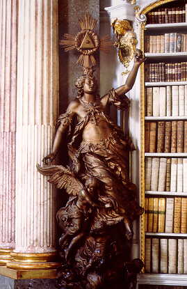 レスコ画,コリント式の柱,大理石の床,書棚の上の壁には木彫群.