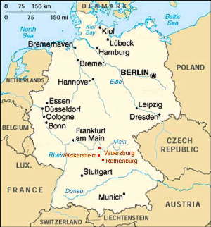 ローテンブルクの位置です。先日紹介したヴュルツブルクと、田舎城主の城館のある町ヴァイケルスハイムも。